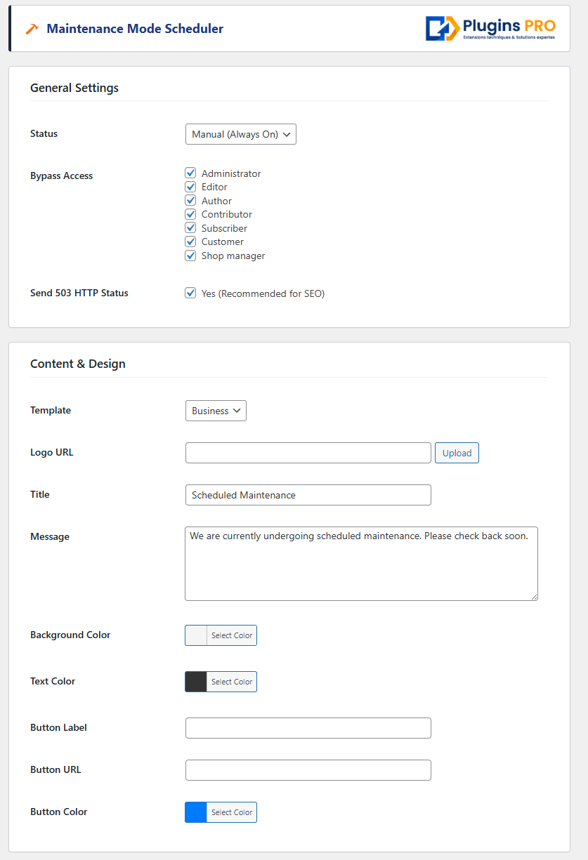 Le plugin inclut également des options utiles comme la gestion des rôles autorisés à contourner la maintenance, le code HTTP 503 pour les moteurs de recherche, l’exclusion de certaines pages et plusieurs styles de présentation.