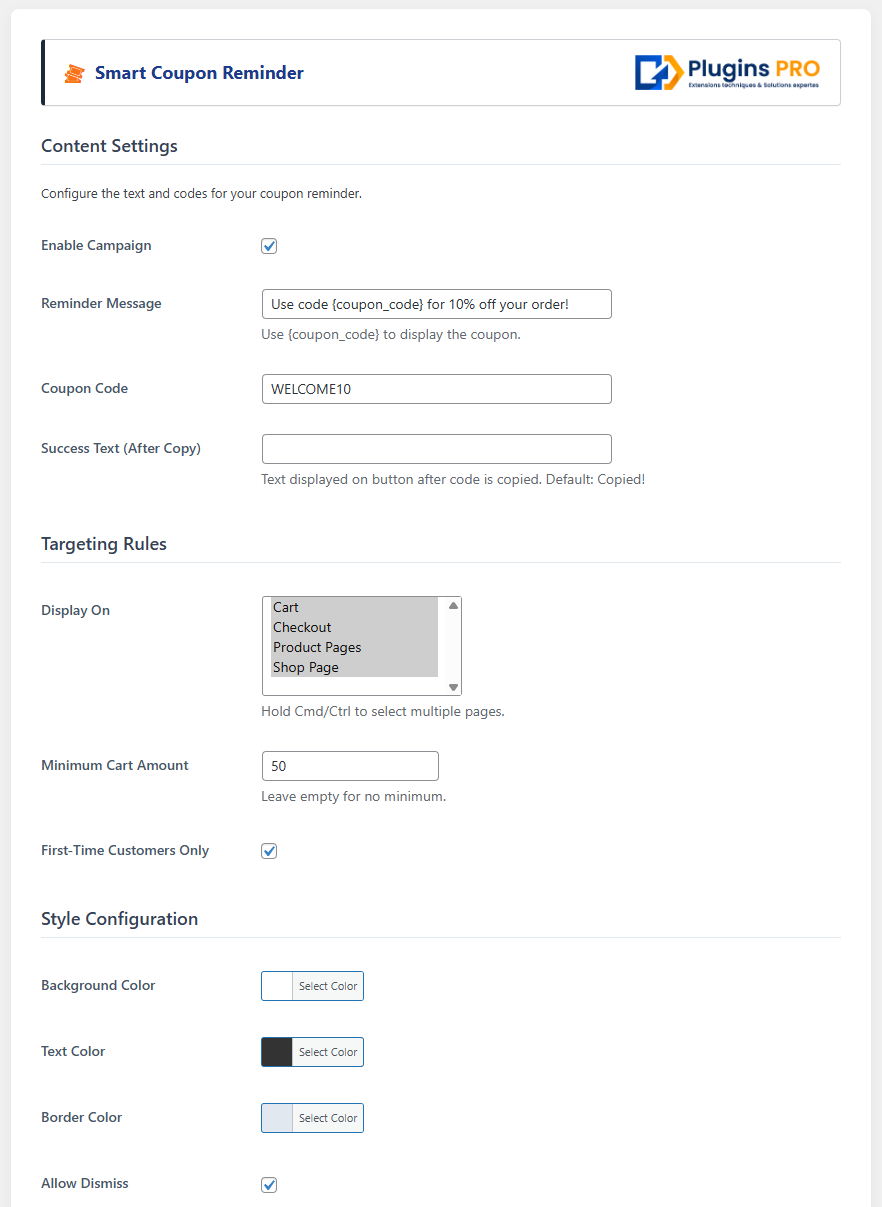 Au lieu de simplement publier un code promo quelque part sur le site, ce plugin permet d’afficher des rappels ciblés sur le panier, le checkout, les fiches produits ou d’autres zones importantes du parcours d’achat. Vous pouvez adapter les messages, les conditions d’affichage et le style afin de présenter la bonne offre au bon moment.